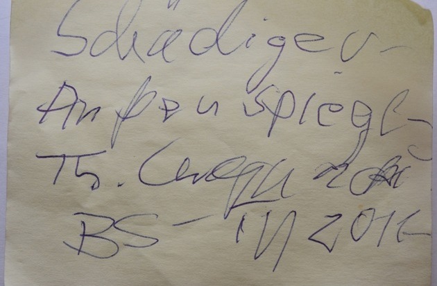 Eine Sarstedterin parkte am 18.06.2017, gegen 09:00 Uhr, ihren silberfarbenen Mazda auf dem Parkplatz der Regenbogenschule. Am 19.07.2017, gegen 06:40 Uhr stellte sie fest, dass der Außenspiegel der Beifahrerseite herunter hing. Die Geschädigte fand einen Zettel an der Windschutzscheibe, der ihr allerdings auch nicht weiter half, weil die Nachricht schwer entzifferbar ist. Es kann nicht gesagt werden, ob der Zettel vom Verursacher oder einem Zeugen stammt. Die Polizei bittet um Hinweise unter der Telefonnummer 05066-9850.
