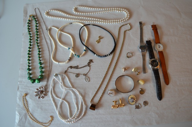 Ein aufmerksamer Zeuge hat gestern am 10.08.2017 beim Rasenmähen im angrenzenden Gebüsch in der Berliner Straße Ecke Selkeweg einen Beutel mit Schmuck gefunden. Die Polizei konnte den Schmuck bisher keinen konkreten Taten zuordnen. Bei den aufgefundenen Sachen handelt es sich offensichtlich um keine hochwertigen Gegenstände. Vermutlich wurden die wertvollen Schmuckstücke verwertet und die minderwertigen Schmuckstücke einfach im Gebüsch entsorgt. Es liegt aber die Vermutung nahe, dass auch dieser Schmuck aus Einbruchdiebstählen stammt. Insbesondere der Armreif mit der Gravur "R.G.P 18" könnte vielleicht von einem Geschädigten wiedererkannt werden.