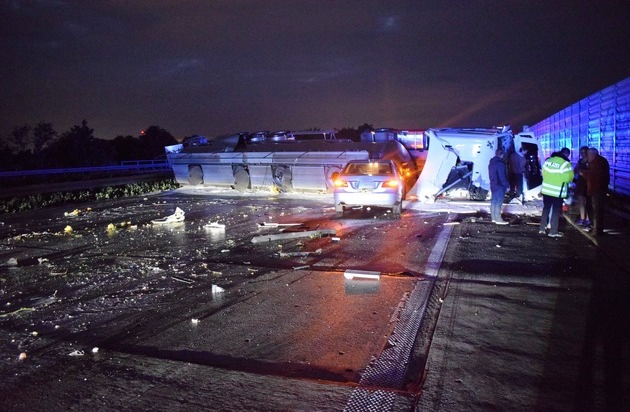 Am 23.06.2018 gegen 22:50 Uhr befährt ein 57-jähriger aus dem Landkreis Nienburg/Weser mit seinem 40-t-Sattelzug die A 7 in Richtung Hannover. In einer Gefällestrecke, kurz vor der Anschlußstelle Hildesheim überholt er einen anderen Lkw. Beim Einscheren nach rechts gerät er aus bisher unbekannten Gründen ins Schleudern, prallt nach links gegen die Mittelschutzplanke, stürzt um und bleibt auf der rechten Seite liegen. Dadurch blockiert er die dreispurige Autobahn voll.