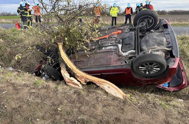 Dingelbe/ Garbolzum (web) - Am heutigen Vormittag, gegen 10:00 Uhr, kam es auf der Kreisstraße 210, zwischen der B 1 bei Garbolzum und der Ortschaft Dingelbe zu einem folgenschweren Verkehrsunfall. Zum Unfallzeitpunkt befuhr eine 78jährige Fahrzeugführerin mit ihrem Pkw Toyota die K 210 aus Rtg. B1 kommend in Rtg. Dingelbe. Aufgrund von Unachtsamkeit der Fahrzeugführerin kam der geführte Pkw nach rechts von der Fahrbahn ab. Im Grünstreifen stieß der Pkw gegen einen Straßenbaum, überschlug sich und blieb auf dem Dach liegen. Die Fahrzeugführerin aus dem östlichen Landkreis Hildesheim wurde in ihrem Fahrzeug eingeschlossen und musste von den Kräften der Feuerwehr aus dem Inneren über den Kofferraum gerettet werden. Mehrere Ersthelfer kamen der Frau bereit zuvor zur Hilfe. Die ansprechbare Fahrzeugführerin wurde im Anschluss mit einem Rettungswagen in ein Krankenhaus nach Hildesheim verbracht. An dem Pkw entstand Totalschaden. Auch der Baum wurde entwurzelt und zerstört. Der Gesamtschaden wird auf ca. 7.000 Euro geschätzt. Neben zwei Streifen der Polizei und Kräften der Feuerwehr Dingelbe kamen auch zwei Rettungswagen, ein Notarzt und ein örtlicher Abschlepper zum Einsatz. Die K 210 musste zeitweise für den Verkehr gesperrt werden. Es kam nur zu geringen Behinderungen.