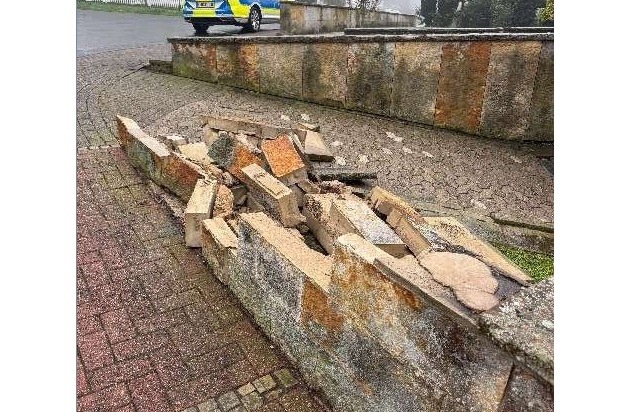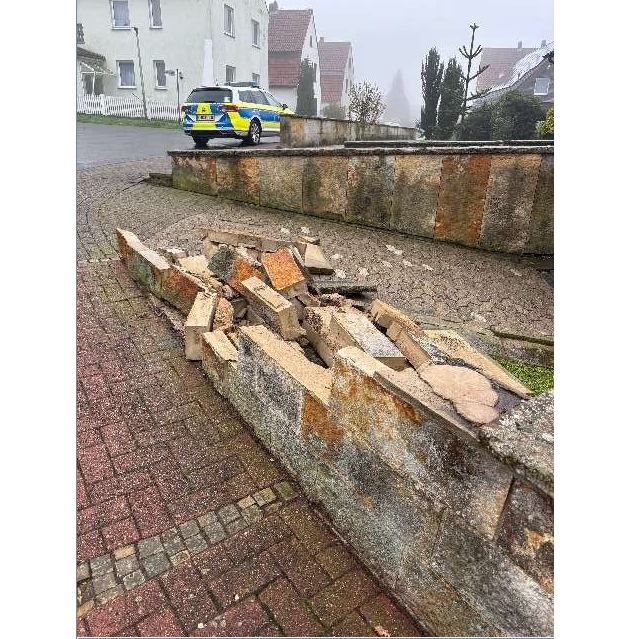 (Gav) Zwischen Samstag, 15.11.2025, 21:30 Uhr, und Sonntag, 16.11.2025, 05:20 Uhr, wurde im Weheweg in Obernkirchen eine Sandsteinmauer durch ein unbekanntes Fahrzeug beschädigt.