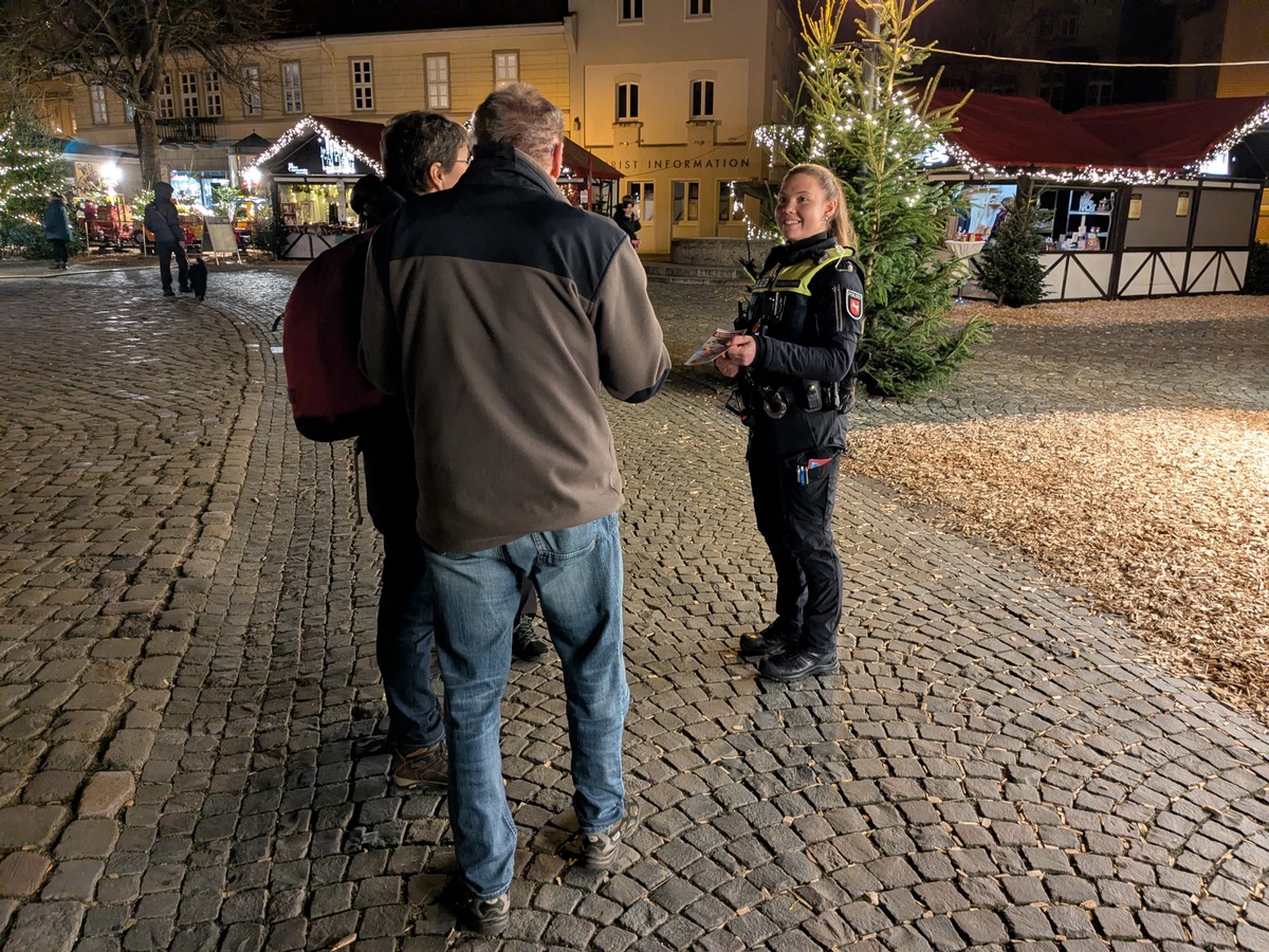 Die Kontrollwoche startete gestern auf dem Weihnachtsmarkt in Bad Gandersheim. Ziel der Auftaktaktion war es, Bürgerinnen und Bürger aktiv anzusprechen und direkt vor Ort Präventionshinweise zu vermitteln.