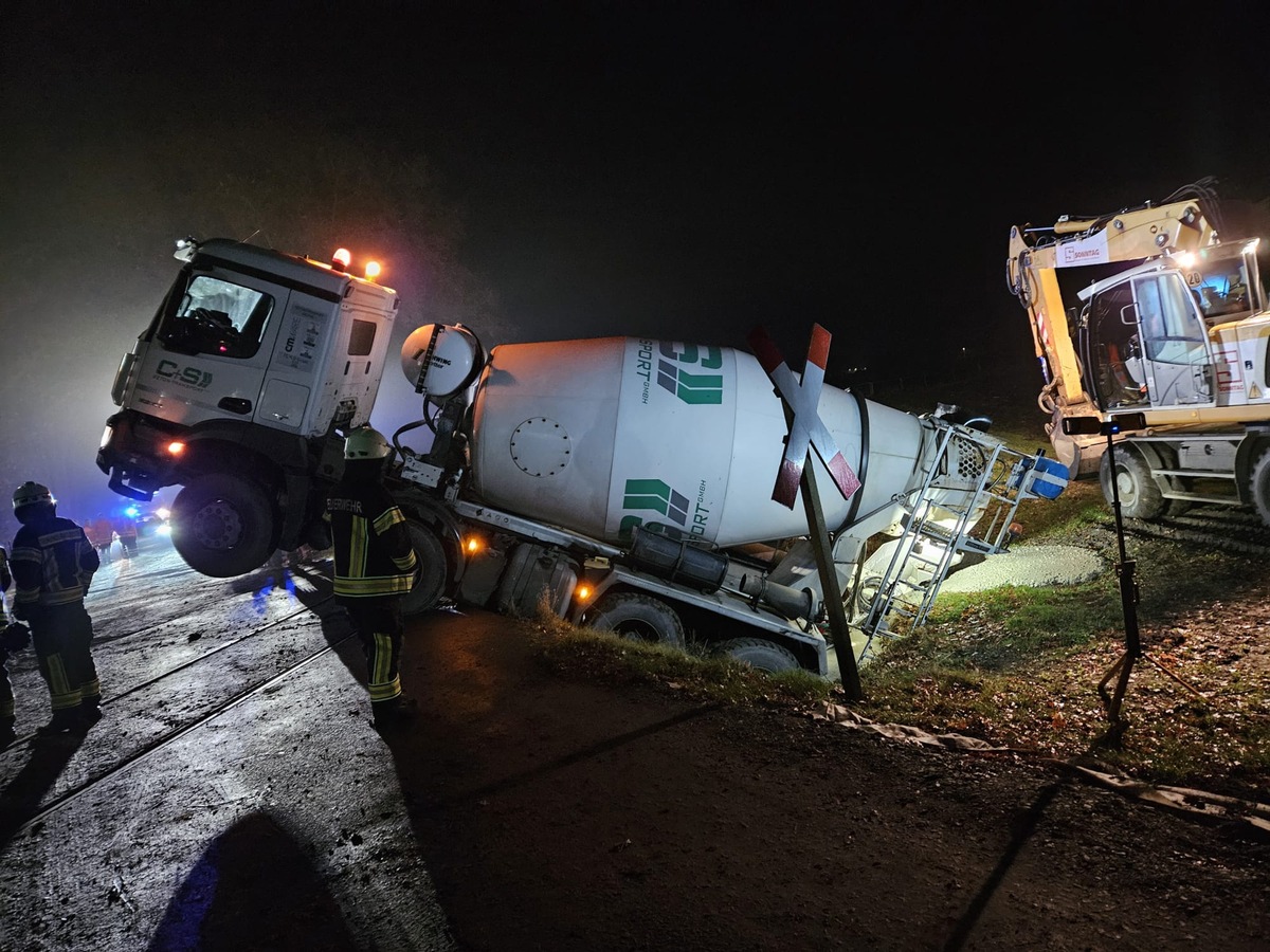 Die Fahrgäste wurden mit Bussen im Ersatzverkehr transportiert. Bei dem Betonmischer liefen dann mehrere Kubikmeter Frischbeton in den Graben aus.