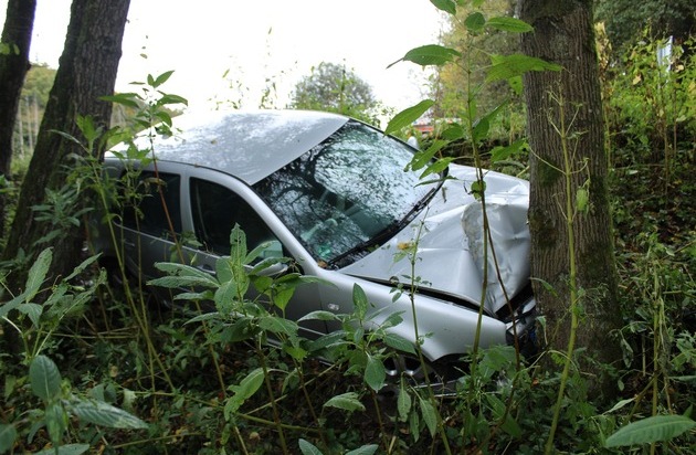 Anschließend kam sie von rechts von der Fahrbahn ab und fuhr mehrere Meter im Grünstreifen einen Straßengraben herab, bis sie frontal mit einem Baum kollidierte.