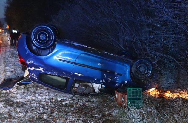 Am Montagmorgen, 24. November, gegen 7.10 Uhr, kam es auf der Lauenförder Straße zu einem Verkehrsunfall. Eine 25-jährige Frau aus Lauenförde verlor in Richtung Würgassen unterwegs auf winterglatter Fahrbahn in einem Kurvenbereich die Kontrolle über ihren Renault Clio. Das Fahrzeug kam von der Straße ab, kollidierte mit einem Baum, überschlug sich und blieb auf dem Dach liegen. Die Fahrerin konnte sich selbstständig aus dem Wrack befreien. Sie erlitt leichte Verletzungen und wurde zur weiteren Untersuchung mit einem Rettungswagen in ein Krankenhaus gebracht. Am Fahrzeug entstand Totalschaden. Ein Abschleppdienst barg den Pkw. Der Sachschaden wird auf rund 3.000 Euro geschätzt. Die Polizei weist darauf hin, dass winterglatte Straßen besondere Vorsicht erfordern und empfiehlt angepasste Geschwindigkeit und vorausschauendes Fahren./rek