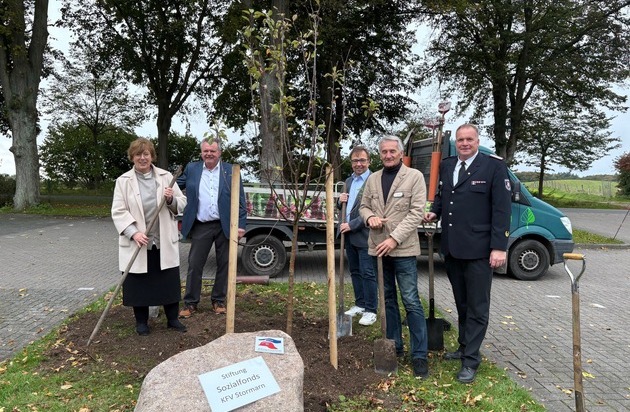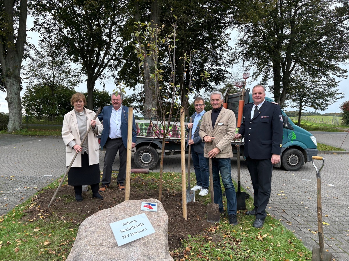 Travenbrück, 09. Oktober 2025 - Mit einem feierlichen Gründungsakt auf dem Gelände des Kreisfeuerwehrverbandes Stormarn wurde heute die "Stiftung Sozialfonds der Feuerwehren im Kreis Stormarn" ins Leben gerufen. Die Stiftung wird errichtet, um in Notlagen schnell und unbürokratisch zu helfen sowie wirksame Solidarität zu leben, insbesondere dann, wenn das Leben aus den Fugen gerät. Zur Feierstunde reisten zahlreiche Ehrengäste an. Darunter auch die Innenministerin Sabine Sütterling-Waack. Die Schirmherrschaft übernahm Kreispräsident Hans-Werner Harmuth. Fast 50 Gründungsmitglieder - darunter der Kreispräsident, Landrat, Bürgervorsteher, Bundes- Landtags- und Kreistagsabgeordnete, Bürgermeisterinnen und Bürgermeister, Landwirte, Feuerwehrangehörige, Betriebe und Organisationen - haben gemeinsam einen Stiftungsfonds aufgebaut, der bereits auf fast 20.000,-- Euro angewachsen ist. Als bleibendes Zeichen wurden ein Findling mit Inschrift aufgestellt und ein Apfelbaum gepflanzt.