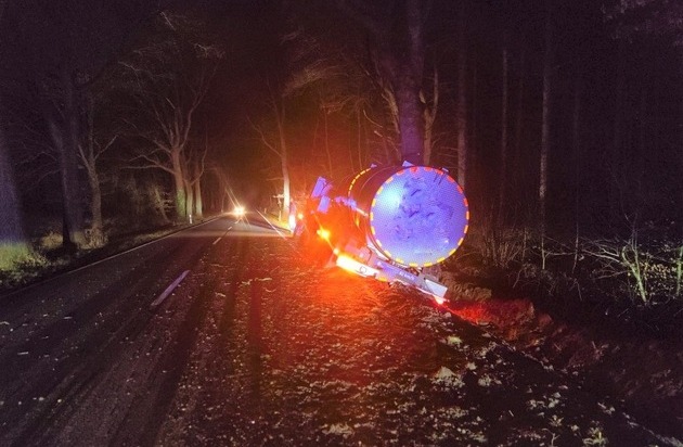 Geestland/Debstedt. Am gestrigen Donnerstagabend (11.12.2025) kam es gegen 21:30 Uhr zu einem Verkehrsunfall auf der Landesstraße 120 zwischen der Einmündung nach Wehden und der Anschlussstelle Debstedt der BAB27. Ein 22-jähriger Mann aus Edewecht war mit einem Milch-Tanklastwagen aus bislang unbekannten Gründen von der Fahrbahn abgekommen und blieb im Seitenraum stecken. Hierbei wurde eine große Menge Erdreich aufgewühlt und auf der Fahrbahn verteilt. Personen wurden durch den Unfall glücklicherweise nicht verletzt.