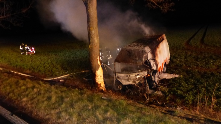 Durch die Wucht des Aufpralls brach die Frontscheibe des Fahrzeugs heraus. Der Transporter selbst wurde rundum beschädigt und kam in einem angrenzenden Feld zum Stehen. Er fing Feuer, wodurch der Fahrer selbst schwer verletzt wurde. Offensichtlich konnte er sich selbst aus dem Innenraum befreien, denn Zeugen fanden ihn neben dem Fahrzeug liegend. Sie brachten den Mann in Sicherheit und informierten die Rettungskräfte. Einer der Zeugen verließ vor dem Eintreffen der Polizei die Unfallstelle. Er wird gebeten, sich umgehend unter der Rufnummer 02421 949-6425 zu melden. Es ist unklar, ob er möglicherweise ergänzende Angaben zum Unfallhergang machen kann.