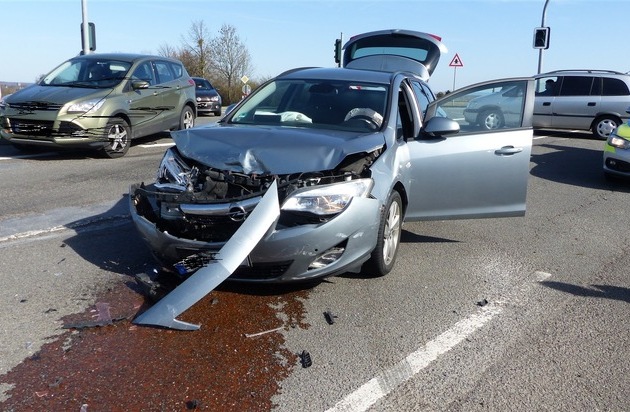 Am 06.04.2018, gegen 16.05 Uhr, befuhr eine 22-jährige Frau aus Düren mit ihrem PKW die Kreisstraße 28 von Drove in Richtung Bundesstraße 56 Ortslage Soller. An der Kreuzung K 28/ B 56 beabsichtigte sie, nach links in Richtung Düren abzubiegen. Dabei erkannte sie einen entgegenkommenden PKW zu spät und beachtete nicht den Vorrang, des 32-jährigen Fahrzeugführers aus Kreuzau. In der Mitte des Kreuzungsbereiches kam es zum Zusammenstoß, bei dem beide Führer und zwei Mitfahrerinnen (19 und 47 Jahre alt) im PKW der Dürenerin leicht verletzt wurden. Zum Glück verhinderten die ausgelösten Airbags in einem Fahrzeug schlimmere Verletzungen. Die Verletzten wurden mit vier Rettungswagen in die umliegenden Krankenhäuser gebracht. Die beiden Fahrzeuge waren nicht mehr fahrbereit und wurden auf eigenen Wunsch der Fahrer abgeschleppt. Die Kreuzung musste während der Unfallaufnahme und zur Bergung der Pkw zeitweise gesperrt werden. Es entstand ein Sachschaden von geschätzt 12000 Euro.