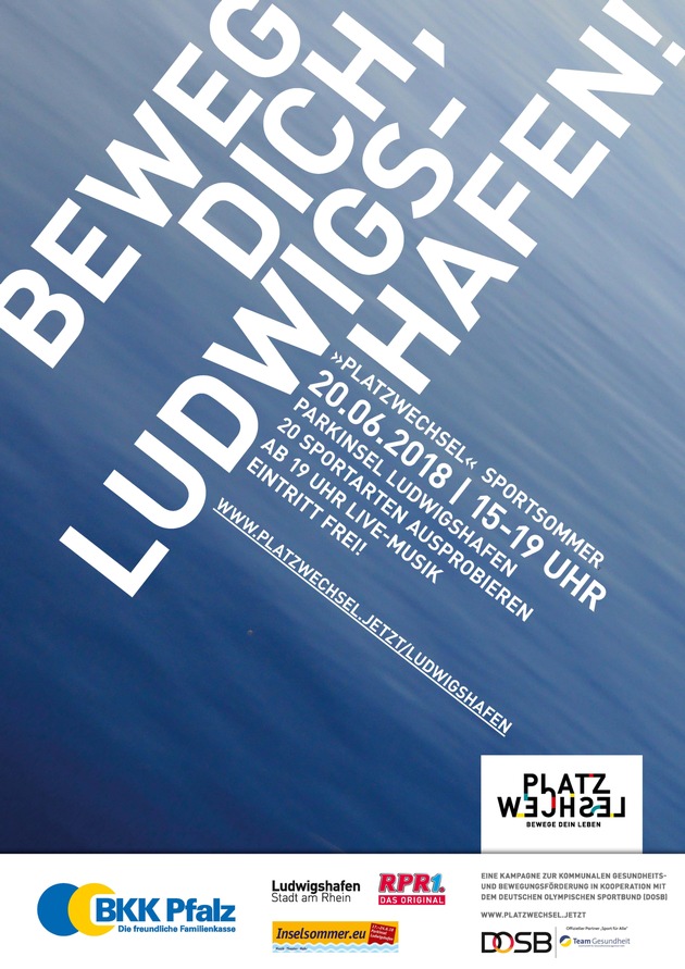 "Beweg Dich, Ludwigshafen: Runter vom Sofa, rein in die Sportsachen!" - So lautet das "Platzwechsel"-Motto, mit dem die BKK Pfalz und die Stadt Ludwigshafen in Zusammenarbeit mit dem Deutschen Olympischen Sportbund ("DOSB") und acht Ludwigshafener Sportvereinen für mehr Bewegung in der Freizeit wirbt. Das Projekt soll die ganze Stadt in Bewegung bringen.