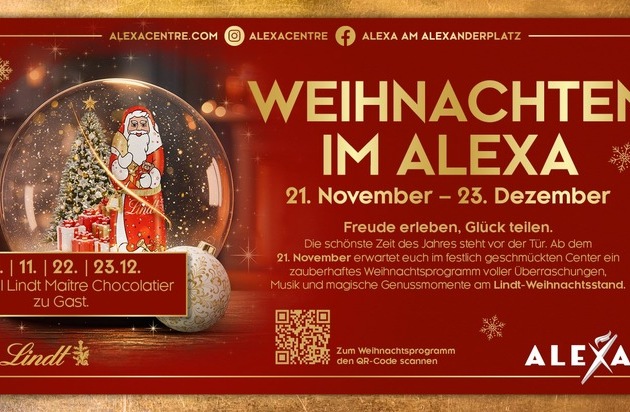Die Weihnachtszeit steht vor der Tür und das ALEXA sorgt zusammen mit dem Partner Lindt für festliche Stimmung. Unter dem Motto „Freude erleben, Glück teilen“ lädt das beliebte Shopping- und Freizeitcenter am Alexanderplatz am Freitag, 21. November alle Weihnachtsfans und die Medien zum Start der Weihnachtswelt ein. Um 15 Uhr werden Oliver Hanna, ALEXA Center Manager und Manuela Görlitz von Lindt die Aktion feierlich eröffnen. Bis zum 23. Dezember dürfen sich alle Besucherinnen und Besucher des ALEXA auf festliche Mitmach-Aktionen, attraktive Gewinnspiele und Überraschungen freuen und zugleich viel Gutes für die Spendenaktion zugunsten des Ronald McDonald Hauses Berlin-Wedding tun.