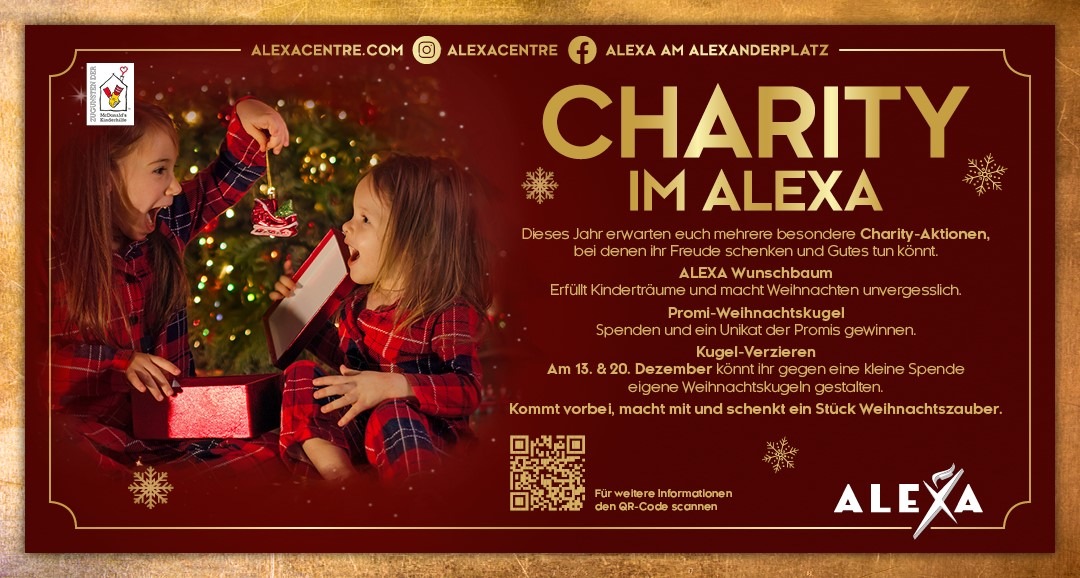 Das ALEXA fördert die wertvolle Arbeit des Ronald McDonald Hauses in Berlin-Wedding und wird dafür von Prominenten wie Axel Schulz, Detlef Soost und vielen weiteren unterstützt. Die Stars haben im Vorfeld Weihnachtskugeln individuell verziert und signiert. Am 21. November ab 15 Uhr wird der ALEXA-Weihnachtsbaum feierlich mit den Charity-Kugeln geschmückt. Mit dabei sind Vertreter von KISS FM, Radio RTL, dem 1. FC Union Berlin und weitere bekannte Persönlichkeiten. Für musikalische Begleitung sorgt die Sängerin Cat Evans. Am 21. Dezember haben alle Besucher für eine kleine Spende die Chance, die exklusiven VIP-Kugeln zu gewinnen.