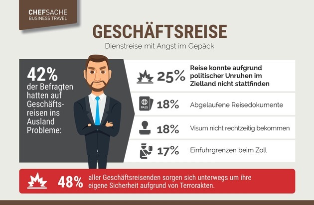 Zu solchen konkreten, unangenehmen Erfahrungen hinzu kommt die Angst vor Terrorakten. 48 Prozent aller Geschäftsreisenden sorgen sich unterwegs um ihre eigene Sicherheit. Besonders Frauen (64 Prozent) und jüngere Reisende unter 40 Jahren (57 Prozent) befürchten, dass ihnen etwas geschehen könnte. Der Verzicht auf die Reise ist jedoch keine Option. Stefan Vorndran, Kampagnenpartner der DRV-Initiative Chefsache Business Travel, erläutert das Problemfeld und weist Lösungswege auf: "Die Verunsicherung wiegt bei Geschäftsreisenden aufgrund der Sicherheitslage in vielen Zielländern doppelt schwer. E-Mail und Telefon können den persönlichen Kundenkontakt nicht ersetzen. Die Sicherheit auf Reisen ist damit zu einem sehr wichtigen Thema für Unternehmen geworden. Die persönliche Betreuung von Geschäftsreisenden kann das Sicherheitsgefühl vergrößern. Ein 24-Stunden-Service für den Notfall sollte sichergestellt sein - insbesondere bei Reisen in Krisenregionen. Hier sind die Services professioneller Geschäftsreisebüros sehr hilfreich."