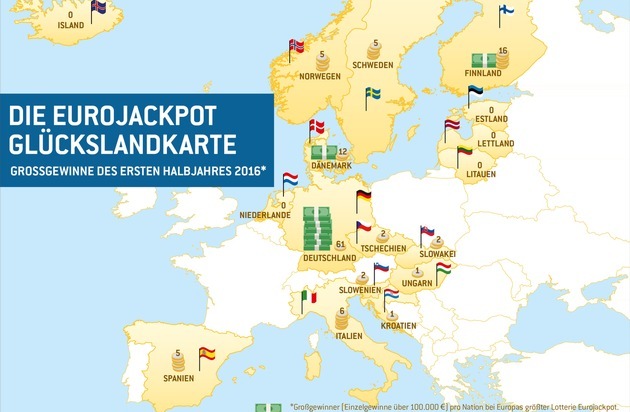 Im ersten Halbjahr 2016 gab es 118 Großgewinne von mindestens 100.000 Euro oder mehr. 13 der Gewinne waren davon im Millionen-Bereich. Neben deutschen Millionären gibt es auch Millionen-Gewinner in Finnland, Dänemark, Norwegen und Italien.
