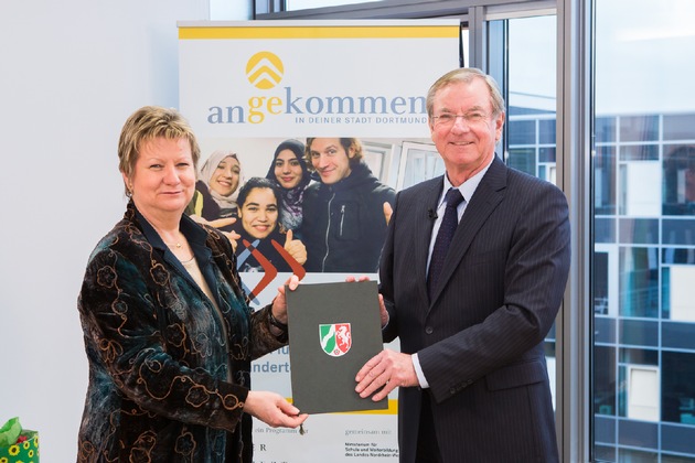 In Dortmund startet ein innovatives Integrationsprogramm für junge Flüchtlinge und Zugewanderte: "Angekommen in deiner Stadt Dortmund". In Vertretung für Schulministerin Sylvia Löhrmann haben Ludwig Hecke, Staatssekretär im Ministerium für Schule und Weiterbildung, sowie der Dortmunder Oberbürgermeister Ullrich Sierau und Prof. Dr. Gunter Thielen, Vorstandsvorsitzender der Walter Blüchert Stiftung, den Kooperationsvertrag für das Gemeinschaftsprojekt unterzeichnet. Mit dem Programm "angekommen" wird ein passgenaues Bildungsangebot für die Zielgruppe der 16- bis 25-jährigen Jugendlichen aufgebaut und in Dortmund etabliert. Das Zwei-Säulen-Konzept der Stiftung umfasst die individuelle Förderung für einen schnellen Schulabschluss einschließlich Start in eine Berufsausbildung in einem durchlässigen System - bei gleichzeitiger Betreuung und Begleitung auch nach dem Unterricht, an den Wochenenden und in den Ferien, damit Integration gelingen kann.