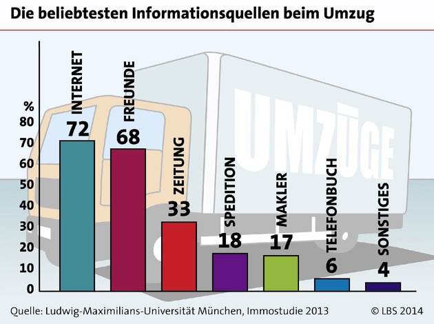 Die Mehrheit der Deutschen, die einen Umzug planen, informiert sich heutzutage online. Das ergab die Immostudie 2013, eine Untersuchung der Ludwig-Maximilians-Universität München. Demnach nutzen über 70 Prozent der Befragten das Internet als Informationskanal. Somit ist das Web mittlerweile noch gefragter als Familie und Freunde - diese werden von 68 Prozent der Befragten um Rat gebeten. Mehrfachnennungen waren möglich.