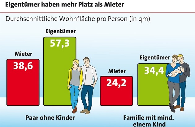 Mit der Familiengründung beginnen viele Menschen, über Wohneigentum nachzudenken. Ein Ergebnis der von der LBS beauftragten Studie "Macht Wohneigentum glücklich" der Universität Hohenheim zeigt: Etwa jeder Dritte der befragten Immobilienbesitzer entschied sich auch aufgrund der Familienplanung für den Schritt ins Eigenheim. Aktuell lebt mit 58 Prozent mehr als die Hälfte aller Familien in den eigenen vier Wänden. Gründe dafür gibt es viele. Wohneigentum bietet deutlich mehr Platz: Während Mieterhaushalte in Deutschland auf durchschnittlich etwa 69 Quadratmetern leben, stehen Immobilienbesitzern laut Statistischen Bundesamt fast 122 Quadratmeter zur Verfügung. Ein großes Plus vor allem für Familien, denn das bedeutet auch: mehr Platz zum Spielen für die Kinder. Zudem sind Eigentümer unabhängig und können so beispielsweise großzügigere Kinderzimmer einplanen. Oft hat das Eigenheim auch einen eigenen Garten, in dem sich der Nachwuchs austoben kann.