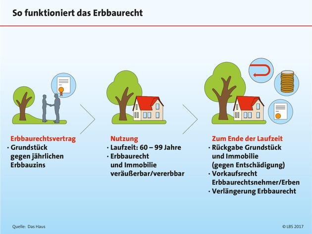 Das Erbbaurecht wird im Grundbuch eingetragen und kann ebenso wie die auf dem Grundstück stehende Immobilie verkauft oder vererbt werden. Für das Erbbaurecht wird ein jährlicher Erbbauzins fällig, der im Schnitt bei drei bis vier Prozent des Grundstückwertes liegt und während der Laufzeit angepasst wird. Für das eingangs erwähnte 400-Quadratmeter-Grundstück ergibt sich somit eine jährliche Belastung von etwa 5.700 Euro. Die Immobilie selbst kann über eine klassische Baufinanzierung mit Bausparvertrag finanziert werden. "Das Erbbaurecht kann gerade in Regionen mit hohen Grundstückspreisen eine Alternative zum Kauf sein", sagt Sven Schüler. "Schließlich bringt der geringere Kapitalbedarf Vorteile bei der Finanzierung."