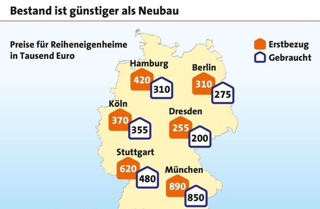 Das Wohngebiet ist erschlossen, die Einkaufsmöglichkeiten liegen gleich in der Nähe, und zu Schule oder Kindergarten ist es auch nicht weit: Viele Käufer reizt an Bestandsimmobilien vor allem die schon gut ausgebaute Infrastruktur. Auch die Tatsache, dass sie sich bereits im Vorfeld ein genaues Bild vom künftigen Zuhause machen können und sich nicht nur auf Zeichnungen und Baupläne verlassen müssen, fällt positiv ins Gewicht. Hinzu kommt das Preisargument: Gebrauchte Immobilien sind in Deutschland deutlich günstiger als Neubauten. So bezahlen Käufer eines Reihenhauses aus zweiter Hand im Schnitt 23 Prozent weniger gegenüber einem Neubau. Eine gebrauchte Eigentumswohnung ist rund 40 Prozent günstiger als eine neu erbaute, wie der "Markt für Wohnimmobilien 2017" zeigt. "Je nach Baujahr und Zustand der Immobilie sollten Käufer allerdings zusätzliche Kosten für die Instandhaltung oder für Modernisierungen, etwa aufgrund energetischer Mindestanforderungen, von vornherein in die Finanzierung einkalkulieren", rät Monika Grave von der LBS.