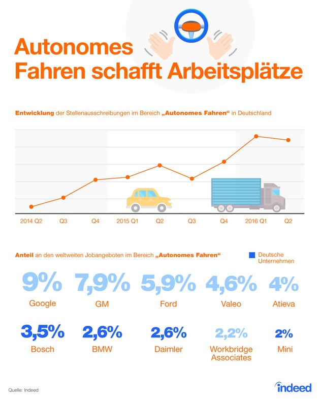 Autonomes Fahren, Elektromobilität und neue Mobilitätskonzepte - die deutsche Automobilindustrie ist in den Zukunftstechnologien im weltweiten Vergleich gut aufgestellt. Dies ist das Ergebnis einer aktuellen Auswertung von Indeed, der weltweit größten Jobseite, bei der Jobausschreibungen wichtiger Automobil-Nationen untersucht wurden. Bei den Ausschreibungen deutscher Unternehmen finden sich besonders viele Stellenprofile, die auf die Zukunft der Mobilität ausgerichtet sind. EntwicklungsingenieurInnen, SoftwareentwicklerInnen, IT-ProjektmanagerInnen sowie Ausschreibungen im IT-Prozess und IT-Service Management rangieren allesamt unter den Top 10.