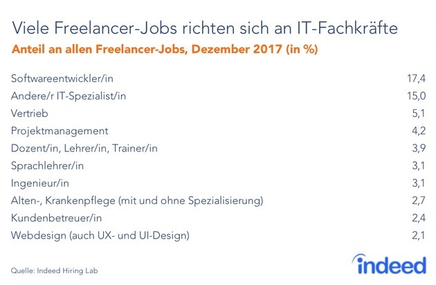Freiberufliche Tätigkeiten gewinnen immer mehr an Attraktivität auf dem deutschen Arbeitsmarkt. So hat sich Anzahl der Suchen nach derartigen Jobs in den letzten zwei Jahren mit einem Anstieg um 94,7 Prozent nahezu verdoppelt. Das ist das Ergebnis einer Arbeitsmarktanalyse des Indeed Hiring Labs. Unter der Leitung von Annina Hering, Economist bei Indeed, wurden dafür bundesweite Stellenausschreibungen und Jobsuchen von 2015 bis 2017 ausgewertet. Viele Arbeitgeber stellen sich auf diesen unverkennbaren Trend ein und schreiben vor allem Stellen in Mangelberufen zunehmend auch als Freelancer-Jobs aus. So werden hauptsächlich Softwareentwickler/innen (17,4% der ausgeschriebenen Freelancer-Jobs) sowie andere IT Spezialisten/innen (15%) als sogenannte "Freie Mitarbeiter" gesucht. Die ausführliche Auswertung finden Sie hier: http://ots.de/isbowj