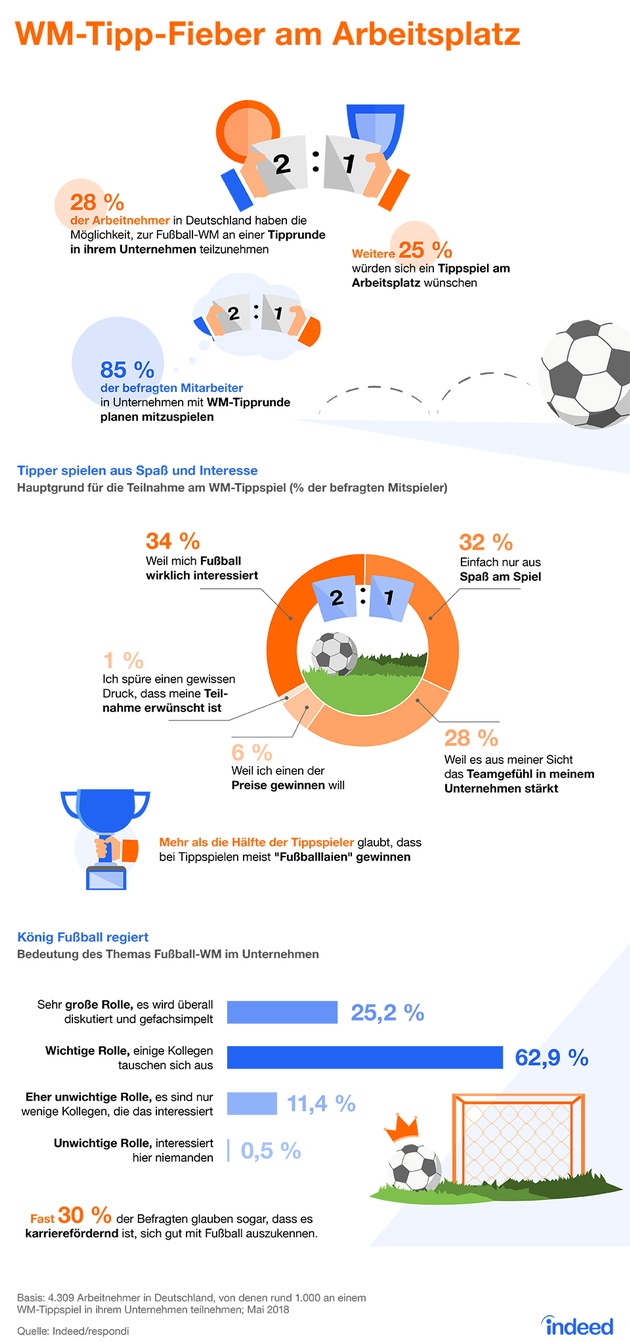 Die bevorstehende Fußball-Weltmeisterschaft spielt auch in zahlreichen deutschen Büros eine große Rolle. Die Jobbörse Indeed hat gemeinsam mit dem Marktforschungsunternehmen Respondi bundesweit 4.309 Arbeitnehmer zu WM-Tippspielen befragt. Demnach sagen 28 Prozent der Befragten, dass in ihrem Unternehmen eine WM-Tipprunde geplant ist. Ein weiteres Viertel würde eine solche begrüßen. Dazu passt: 85 Prozent der Mitarbeiter, an deren Arbeitsplätzen die Ergebnisse der 64 WM-Spiele organisiert getippt werden, nehmen auch an diesen Spielrunden teil. Satte 88 Prozent geben zudem an, dass die WM während der vier Wochen, in denen sie stattfindet, eine große oder wichtige Rolle in den Gesprächen an der Kaffeemaschine, am Schreibtisch oder in der Mittagspause spielt. Manche glauben gar, dass Fußballsachverstand in solchen Gesprächen karrierefördernd sei. Davon sind immerhin 29 Prozent überzeugt.