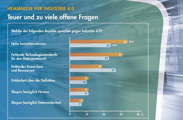 Positiv ist der steigende Bekanntheitsgrad des Themas Industrie 4.0: Fehlte in den vergangenen Jahren vielen Firmen noch die grundlegende Aufklärung, so sehen sich mittlerweile die meisten mit dem nötigen Know-how gerüstet - nur 19% aller Befragten halten diesen Faktor noch für problematisch (Stand 2014: 27%). "Die generelle Auseinandersetzung mit dem Thema führt bereits zu einem erhöhten Grundverständnis und auch das Bewusstsein für die Notwendigkeit effizienter Prozesse hat deutlich zugenommen", so die Einschätzung von Stefanie Naujoks, Analystin bei PAC.