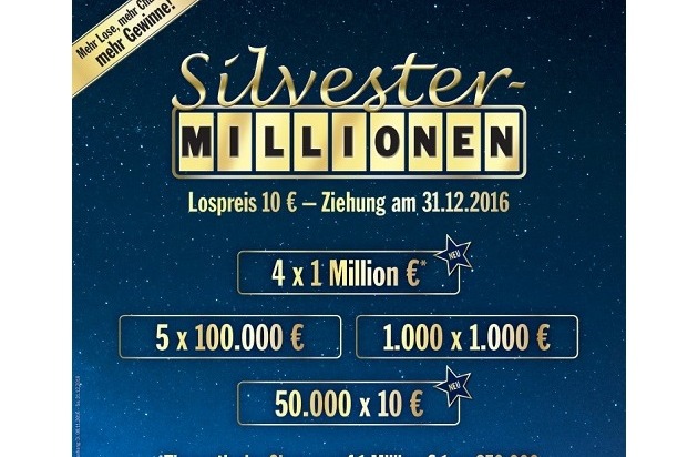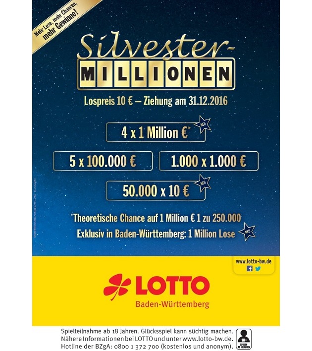 Die Silvester-Millionen gingen 2016 zum siebten Mal exklusiv in Baden-Württemberg an den Start. Die insgesamt 1 Million Lose waren in den baden-württembergischen Lotto-Annahmestellen sowie im Internet unter www.lotto-bw.de und die offizielle LottoBW-App verfügbar. Sie waren in diesem Jahr in Rekordzeit bereits vor Weihnachten vergriffen.