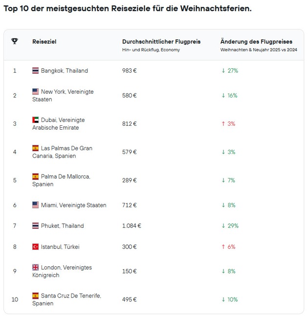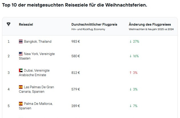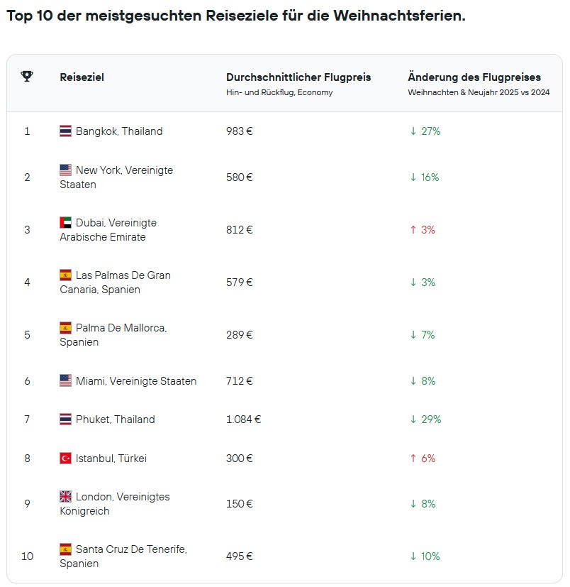 *Die Daten basieren auf Flugsuchen, die auf KAYAK.de und den dazugehörigen Marken im Zeitraum vom 15.06.2025 bis 10.09.2025 durchgeführt wurden - für Flüge mit Abflug zwischen dem 20.12.2025 und 02.01.2026 und Rückflug zwischen dem 25.12.2025 und 10.01.2026, ab allen deutschen Flughäfen. Diese Daten wurden mit Suchanfragen aus dem Zeitraum vom 15.06.2024 bis 10.09.2024 verglichen, die Flüge mit Abflug zwischen dem 21.12.2024 und 03.01.2025 und Rückflug zwischen dem 25.12.2024 und 11.01.2025 betrafen. Alle Flugpreise beziehen sich auf den durchschnittlichen Preis für Hin- und Rückflüge in der Economy Class. Preise können variieren; Prozentangaben zu Veränderungen bei Suchen und Preisen sind annähernd.