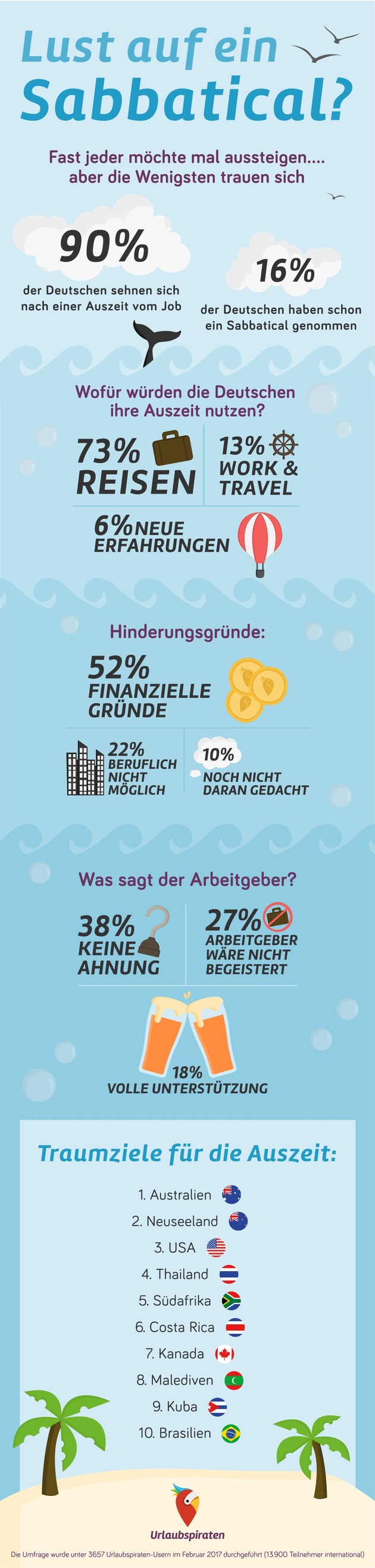 90 Prozent der Deutschen haben schon einmal an eine längere Auszeit vom Job gedacht, aber nur 16 Prozent hatten bisher den Mut und die Möglichkeit, diesen Traum in die Tat umzusetzen. Hauptmotiv für die Pause aus dem Arbeitsleben: Der Wunsch zu reisen. Das ist das Ergebnis einer Urlaubspiraten-Umfrage unter 13.000 Usern der Website, die im Februar 2017 durchgeführt wurde.