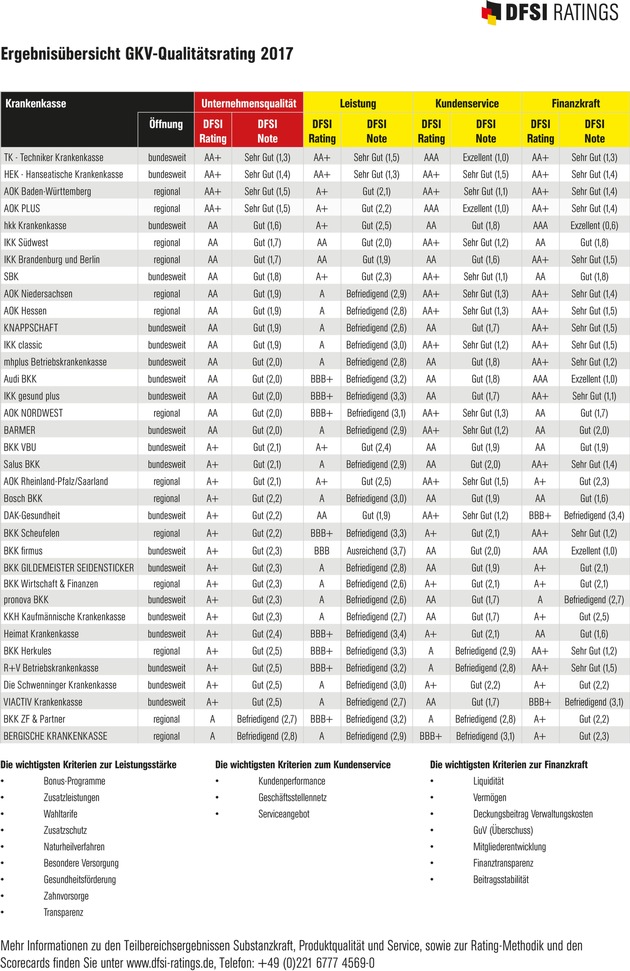 DFSI Ratings untersuchte auch in diesem Jahr gesetzliche Krankenkassen hinsichtlich angebotener Zusatzleistungen, Service und Finanzkraft. Wie im Vorjahr kam die TK - Techniker Krankenkasse auf Platz 1 - knapp vor der HEK - Hanseatische Krankenkasse. AOK Baden-Württemberg und AOK Plus teilten sich Platz drei beim DFSI-Qualitätsrating.