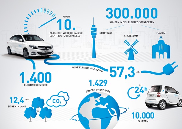 "Die Zukunft des Carsharings ist elektrisch, das ist unsere Überzeugung", sagt Olivier Reppert, CEO von car2go. An drei rein elektrisch betriebenen Standorten hat car2go mittlerweile 300.000 Kunden, die regelmäßig mit den 1.400 Elektrofahrzeugen des Marktführers im flexiblen Carsharing unterwegs sind. Täglich werden dabei 10.000 Fahrten unternommen. Insgesamt haben car2go Kunden bereits 57,3 Millionen reine Elektro-Kilometer zurückgelegt. Das entspricht 1.429 Runden um die Erde oder so vielen Tonnen CO2 wie 12,4 Millionen Eichen oder ein 24.000 Hektar großer Fichtenwald jährlich binden könnten.