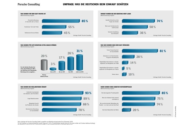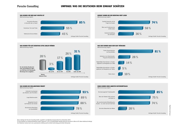 Was macht Kunden wirklich zufrieden? Das wollte die Managementberatung Porsche Consulting von den Deutschen wissen. Guter Service fängt schon weit vor dem Kauf an: 85 Prozent der Deutschen legen großen Wert auf persönliche Beratung, wenn sie größere Anschaffungen planen - zum Beispiel Möbel, Computer oder Elektrogeräte mit Preisen von über 500 Euro. Das ergab die aktuelle Umfrage, die Porsche Consulting vom Meinungsforschungsinstitut Forsa repräsentativ ausführen ließ.