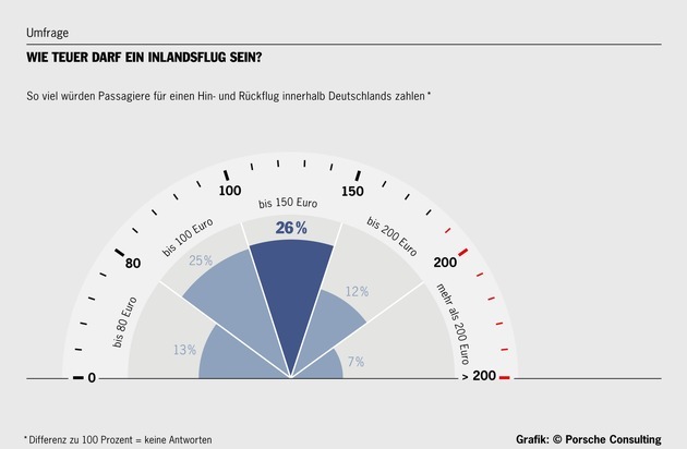Innerdeutsch fliegen ist vergleichsweise kostengünstig. Doch nur die wenigsten Fluggäste sind bei Reisen innerhalb des Landes konsequente Schnäppchenjäger: Gerade einmal 13 von 100 Passagieren würden maximal 80 Euro für eine Kurzstrecke (hin und zurück) bezahlen. Das ergibt eine aktuelle repräsentative Umfrage der Managementberatung Porsche Consulting. 80 Euro entsprechen in etwa dem Mindestpreis, den Fluggesellschaften bei Aktionen anbieten. Meist muss dafür weit im Voraus gebucht und auf kundenfreundliche Stornoregelungen verzichtet werden. Jeder vierte Fluggast akzeptiert einen Ticketpreis von 100 Euro. Und nahezu jeder zweite (45%) ist bereit, für ein Ticket deutlich mehr als 100 Euro auszugeben. Die Obergrenze von 150 Euro akzeptieren 26 Prozent. Erst bei 200 Euro setzen 12 Prozent ihr persönliches Limit. Und mehr als 200 Euro würden immerhin noch 7 Prozent bezahlen.