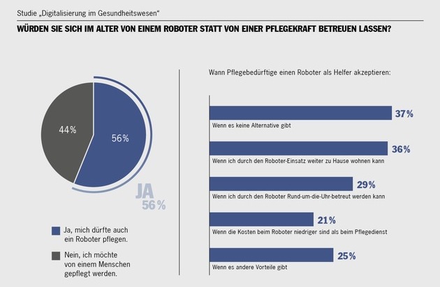"In einem Zeitraum von drei bis fünf Jahren wird die Digitalisierung soweit fortgeschritten sein, dass Roboter im Gesundheitswesen und in der Pflege weitreichende Aufgaben übernehmen könnten", sagt Dr. Roman Hipp, Partner bei Porsche Consulting und verantwortlich für den Bereich Health Care. Für Hipp tragen "fortschrittliche Entwicklungen in der Medizintechnik seit langem zur Verbesserung der Heilung und Pflege von Menschen bei". Die Akzeptanz sei auf der Patientenseite bereits erstaunlich gut ausgeprägt, so Hipp. Jetzt gehe es darum, dass Krankenhäuser und das Pflegewesen die organisatorischen Voraussetzungen für mehr Digitalisierung schaffen würden. Hipp: "Wenn Ärzte und Mitarbeiter in der Pflege bei Standardtätigkeiten entlastet werden, könnten Mangel und Notstände im Gesundheitswesen abgebaut werden."