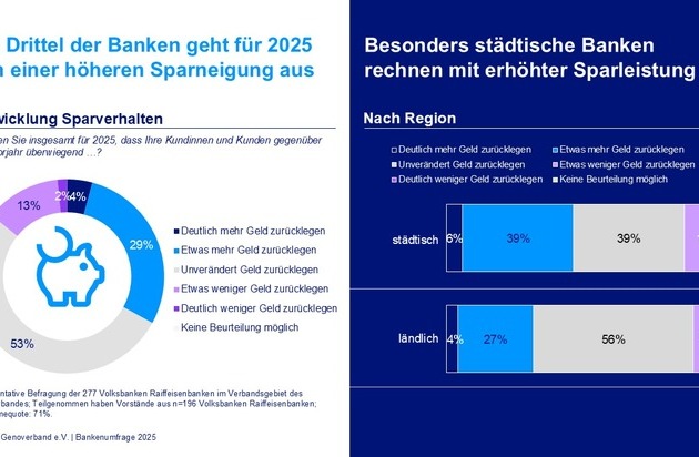 Ein Drittel der Banken erwarten in der Umfrage des Genoverbandes, dass ihre Kundinnen und Kunden in diesem Jahr überwiegend mehr Geld zurücklegen als 2024 – nur 15 % gehen von einer geringeren Sparneigung aus, 53 % sehen keine Veränderung. Hoeck: „Sparen in Zeiten hoher Unsicherheit ist sehr herausfordernd. Gerade jetzt begleiten die Volks- und Raiffeisenbanken ihre Kunden intensiv. Das ist essenzieller Bestandteil ihres genossenschaftlichen Förderauftrags. Der Weltspartag am 30. Oktober 2025 bietet auch in diesem Jahr einen passenden Anlass für den Dialog.“ Die ca. 14,9 Millionen Kundinnen und Kunden im 14 Bundesländer umfassenden Verbandsgebiet unterhalten bei den Volks- und Raiffeisenbanken rund 28,4 Millionen Konten, darunter 15,2 Mio. Kontokorrentkonten.