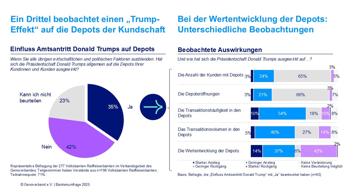 „Wir sehen 2025 eine ambivalente Entwicklung. Einerseits wird wieder – wie in der Niedrigzinsphase – ein wachsender Anteil der Kundeneinlagen in der Bankbilanz auf Tagesgeld- oder Girokonten geparkt. Aktuell sind es fast zwei Drittel. Viele Kundinnen und Kunden setzen also verstärkt auf Sicherheit und Verfügbarkeit und nehmen so – ob bewusst oder unbewusst - Abstriche bei der Rentabilität in Kauf. Die Gefahr dabei: Man spart sich angesichts der Inflation von aktuell 2,4 Prozent gewissermaßen arm. Andererseits lässt die Entwicklung der Depots aber auch eine Verschiebung zu renditestärkeren Anlageformen erkennen“, analysiert Genoverband-Vorstandsvorsitzender Michael Hoeck. „Um die Inflation zu schlagen, sollten Wertpapiere zum Anlageportfolio gehören, auch wenn es zu temporären Rückschlägen wie im April kommen kann, als es nach den US-Zollankündigungen an den Börsen bergab ging. Angesichts vergleichsweise hoher Renditechancen im langfristigen Durchschnitt ist Angst vor Trump im Depot kein guter Ratgeber. Wichtig bei den hier investierten Mitteln ist, dass diese auf absehbare Zeit nicht für andere Zwecke benötigt werden.“ In einer Umfrage unter den Vorständen der Mitgliedsbanken* bestätigen immerhin 35 % ausdrücklich einen „Trump-Effekt“ auf die Depots der Kundschaft, während 42 % diesen verneinen. Von den 35 % geben etwas mehr als ein Viertel (27 %) an, die Anzahl der Kundinnen und Kunden mit Depots sei dadurch gestiegen (Rückgang: 3 %) und 24 % sehen mehr Depoteröffnungen (Rückgang: 3 %). Eine zunehmende Transaktionshäufigkeit beobachten 64 % (Rückgang: 12 %), steigende Transaktionsvolumen sehen 51 % (Rückgang 14 %). Am wenigsten eindeutig ist die Einschätzung zur Wertentwicklung: 51 % glauben an einen positiven Effekt, 44% an Einbußen. „Wie auch immer man die Auswirkungen von Donald Trumps Politik beurteilt: Sie sind Teil einer volatilen Gemengelage aus anhaltenden geo- und wirtschaftspolitischen Unsicherheiten, gestiegenen Lebenshaltungskosten und Zweifeln an der Zukunftsfähigkeit der sozialen Sicherungssysteme, in der die Menschen dem Sparen zunehmend Priorität einräumen“, ist Hoeck überzeugt.