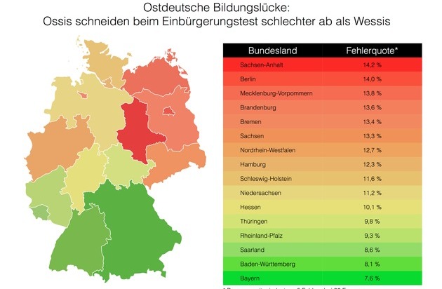Das Bundesland mit der höchsten Fehlerquote ist Sachsen-Anhalt (14,2%), gefolgt von Berlin (14%) und Mecklenburg-Vorpommern (13,8%). Das beste Gesamtergebnis erzielte Bayern mit 7,6% und Baden-Württemberg mit 8,1%. Die neuen Bundesländer schlossen beim Einbürgerungstest somit deutlich schlechter ab, als die alten Bundesländer.
