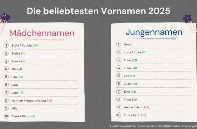 Das Schwangerschaftsportal Babelli.de hat ein repräsentatives Ranking über die beliebtesten Vornamen für das Jahr 2025 erstellt. Etwa 18% aller Geburten in Deutschland wurden hierbei berücksichtigt.