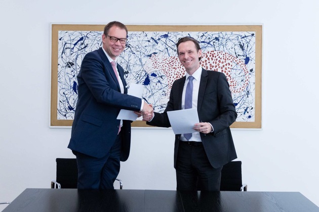 Bildunterschrift der Vertragsunterzeichnung: Thorsten Klindworth, Gründer und Vorstandsvorsitzender der A.B.S. Global Factoring AG (links) und Martin Holzinger, Leiter der Abteilung Non-Core-Beteiligungen der immigon portfolioabbau ag (rechts), nach der Vertragsunterzeichnung.
