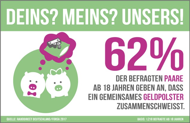 Geld und Finanzen bieten Konfliktpotenzial, auch in der Partnerschaft. Schlüsselfragen wie "Ausgeben oder doch lieber sparen?" können hier durchaus zu Beziehungskillern werden. 41 Prozent der Deutschen würden sich sogar von ihrem Partner trennen, wenn dieser nicht mit Geld umgehen kann, zeigt jetzt eine aktuelle Forsa-Umfrage im Auftrag von RaboDirect Deutschland. Vielleicht mit ein Grund dafür, warum die meisten Partner lieber zusammen entscheiden möchten, wie und in welchem Rahmen mit ihrem Geld gewirtschaftet werden soll.