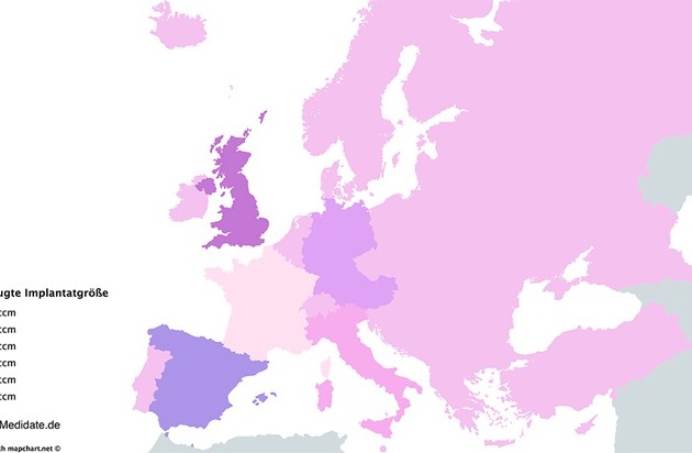 500 verschiedene Implantat-Modelle stehen Patientinnen dabei alleine bei GC Aesthetics, dem führenden Implantathersteller in Europa, zur Auswahl. MediDate bei GC nachgefragt, weitere Statistiken ausgewertet und wichtigsten Fakten zusammengefasst. Dabei zeigen europäische Frauen erstaunliche Präferenzen wie die MediDate-Infografik erstmalig zeigt. Europameister sind dabei die Spanierinnen die ganze 400 ml pro Implantat bevorzugen, gefolgt von den Britinnen (380 ml) und Deutschen (350 ml). Im Gegensatz zu den meisten europäischen Ländern setzten deutsche Frauen aber bevorzugt auf ein anatomische (natürliche) Implantatform.