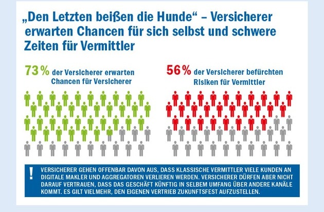Den Vermittlern hingegen werden schwere Zeiten vorhergesagt. 56 % der Versicherer denken, dass hier die Risiken überwiegen. Jakob Baron, Manager bei zeb und Autor der Studie, ergänzt: "Versicherer gehen offenbar davon aus, dass klassische Vermittler gegenüber Aggregatoren und digitalen Maklern Kunden verlieren werden. Aus unserer Sicht sollten die Versicherer jedoch nicht zu sehr darauf vertrauen, dass das Geschäft künftig im selben Umfang über andere Kanäle kommt. Es gilt vielmehr, vor allem den eigenen Vertrieb zukunftsfest aufzustellen."