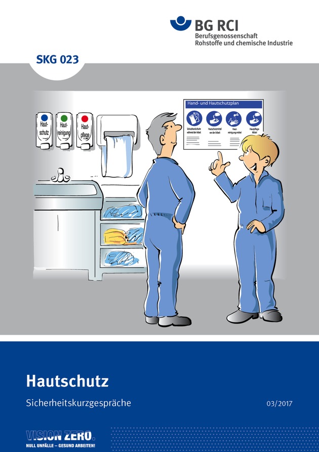 Mit dem neuen Sicherheitskurzgespräch SKG 023 "Hautschutz" der Berufsgenossenschaft Rohstoffe und chemische Industrie (BG RCI) steht den Verantwortlichen in den Betrieben ein anschauliches und ansprechendes Unterweisungsmedium zum Ergreifen geeigneter Hautschutzmaßnahmen zur Verfügung.