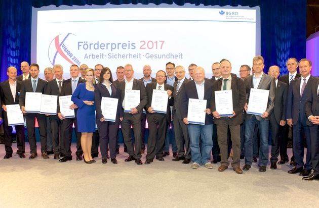 Der "Arbeitsschutz-Oscar" der Berufsgenossenschaft Rohstoffe und chemische Industrie (BG RCI) wurde in diesem Jahr zum 20. Mal verliehen. An dem Wettbewerb 2017 hatten sich deutschlandweit 603 Frauen und Männer mit 232 Beiträgen beteiligt. Für die besten Ideen für eine sichere Arbeitswelt erhielten 21 Preisträger und Preisträgerinnen aus sieben Unternehmen den BG RCI-Förderpreis Arbeit - Sicherheit - Gesundheit. Dieser wurde in sieben Kategorien verliehen. Die Förderpreise sind mit jeweils 10.000 Euro dotiert. Hinzukommen 14 Nominierungsprämien à 1.000 Euro.
