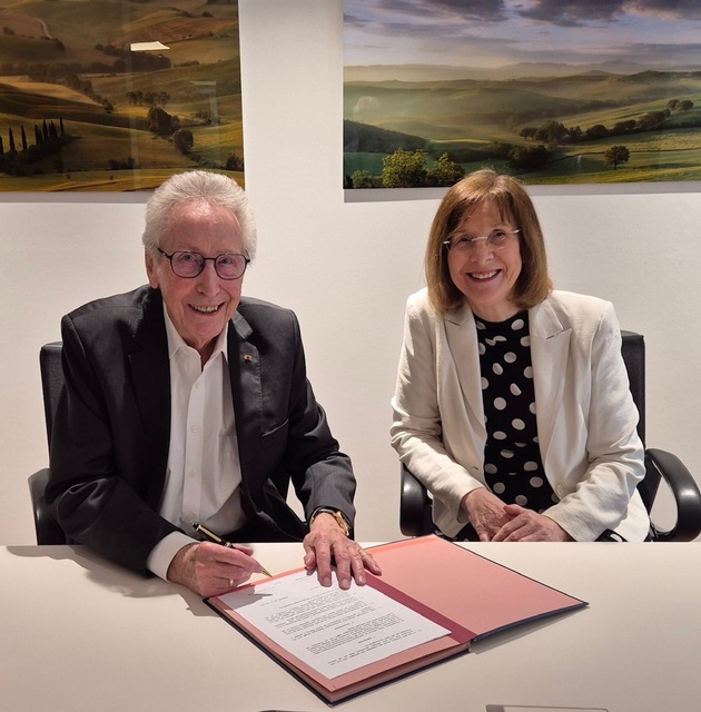 Bildunterschrift: Hans-Werner Hector und Rektorin Katharina Holzinger unterzeichnen die neue Zuwendungsvereinbarung für die Universität Konstanz.