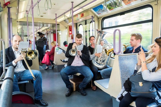 Musikalische Mittagspause in der Stadtbahn-Linie 16: Das Ensemble Drachenfelser Brass unterhielt am heutigen Dienstag um die Mittagszeit die KVB-Fahrgäste zwischen Sürth und Chlodwigplatz. Mit "Lück wie ich un`Du" von den Bläck Fööss und "You Make Me Feel So Young" von George Gershwin sorgten die vier Blechbläser für lockere, schwungvolle Unterhaltung. Eine Reihe von Fahrgästen zückte ihre Handys und filmte den musikalischen Kurzauftritt, und Applaus gab´s natürlich auch. "Klasse", meinte ein Fahrgast beim Verlassen der Bahn. "Das war ja mal eine Überraschung." Und auch die Musiker zeigten sich sehr angetan von dem Auftritt in ungewohnter Umgebung.