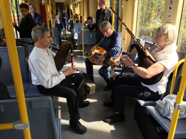 Es war vermutlich der ungewöhnlichste Auftritt in der KVB-Reihe "Musik in der Bahn": Lissa Nierhoff, Christoph Commes und Ruprecht Niepold vom Ensemble "Cornemuse Consort Coelln" unterhielten am Samstagnachmittag mit Dudelsack und Drehleier die Fahrgäste auf der Stadtbahn-Llinie 7 in Porz und in Poll. Bislang hatten vor allem Blasmusik, Chorgesang oder kölsche Töne die Kurzkonzerte in den Stadtbahnen geprägt - die Darbietungen der drei Musiker eröffneten eine ganz neue musikalische Perspektive. Und so kamen die Akteure auch mit interessierten Fahrgästen ins Gespräch: über ihre Instrumente, ihre Musik etc. "Starke Aktion", meinte ein junger Mann im Anschluss.