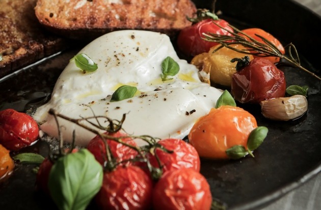 Prall und rot liegen sie jetzt in den Regalen: Vollreife Tomaten aus regionalem Anbau sind besonders lecker, aromatisch und fruchtig - und langsam geröstet mit Burrata ein unschlagbares Geschmackserlebnis.