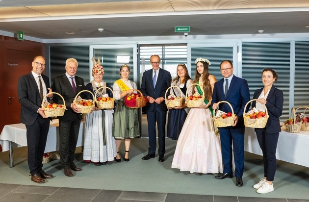 Jedes Jahr im Herbst regiert der deutsche Apfel das Bundeskanzleramt. Das Apfelkabinett ist mittlerweile eine Tradition, die zur Jahreszeit gehört, wie bunte Blätter und die Zeitumstellung. Heute war es wieder so weit: Bundeskanzler Friedrich Merz empfing die Apfel- und Blütenköniginnen aus den bedeutendsten deutschen Obstregionen zum alljährlichen "Apfelkabinett". Wie auch in den Vorjahren, brachten die Botschafterinnen des deutschen Obstbaus ein Präsent mit, das nicht nur Freude bereitet, sondern auch eine klare Botschaft transportiert: Die Stärke und Bedeutung heimischer Obstproduktion. Gerade in Zeiten globaler Lieferkettenkrisen und steigender Importabhängigkeit ist es entscheidend, auf die wertvolle Arbeit unserer Obstbauern hinzuweisen, die mit Leidenschaft und Fachwissen für höchste Qualität sorgen. Jede Frucht steht für ein Stück regionale Identität und für den Erhalt unserer wertvollen Kulturlandschaft - eine Stärke, die es zu bewahren gilt.